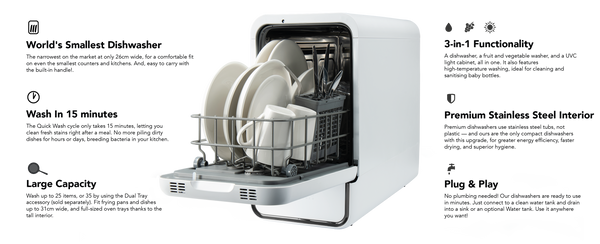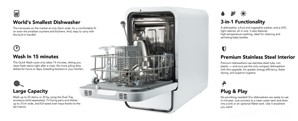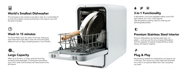 Capsule is the narrowest countertop dishwasher and the only mini dishwasher that fits large items up to 31cm. The multifunctional Dual Tray (sold separately) gives you extra flexibility and allows you to fit up to 35 items and large pots.