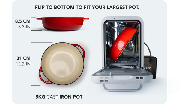 Down below, it unlocks room for the big hitters: full-sized 31 cm (12 in) frying pans, deep casseroles, or even a 5 kg (11 lbs) heavy cast-iron pot.
